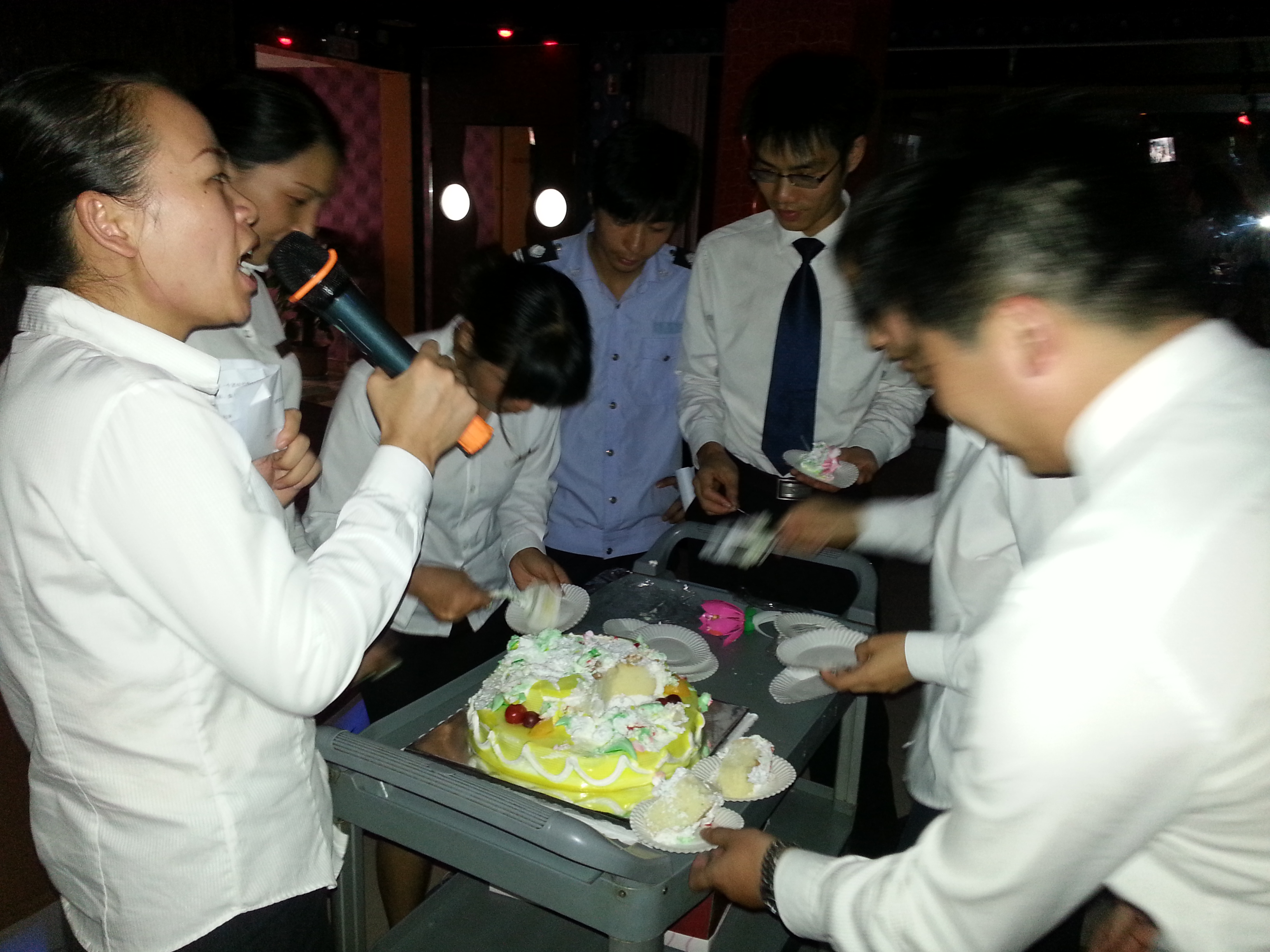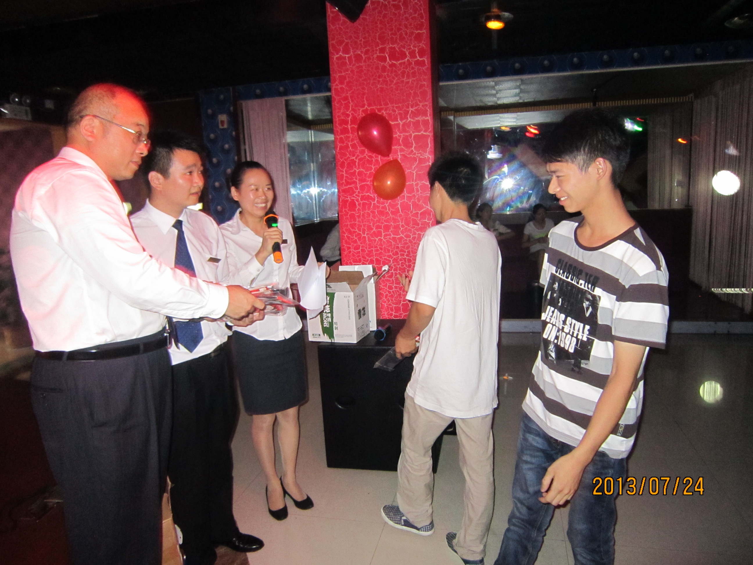 7月24日下午,汉宫KTV热闹非凡,在这里正在进行着迎驾山庄上半年度员工生日会,整场生日联欢会在行政部经理陈俊的一声热情响亮的问好中拉开了序幕,首先由山庄副总经理徐程对寿星员工们致以诚挚的问候并送上了生日礼物。接着“抱成一团”、“快乐传真”等游戏相继开展,员工们童心大发,踊跃报名参与,现场一片欢声笑语,气氛空前高涨,许多幸运的员工都获得了奖品,游戏期间山庄总经理边总,副总经理徐总以及各部门领导纷纷被现场的气氛所感染,为大家献上了歌曲。当“祝你生日快乐......”这首熟悉而又美妙的璇律想起时,工作人员推着生日蛋糕伴随着熟悉的音乐款款而来,大家齐唱生日快乐歌,寿星们闭上了眼睛许下了美好的生日愿望,山庄领导及各部门负责人亲自动手切开生日蛋糕送到了寿星们的手上,将现场的气氛推向了高潮。 此处活动让广大员工在紧张繁忙的工作之余,感受到了迎驾山庄这个大家庭的温暖和同事们的关爱,增强了员工的归宿感,增加了同事之间的感情和集体凝聚力。
