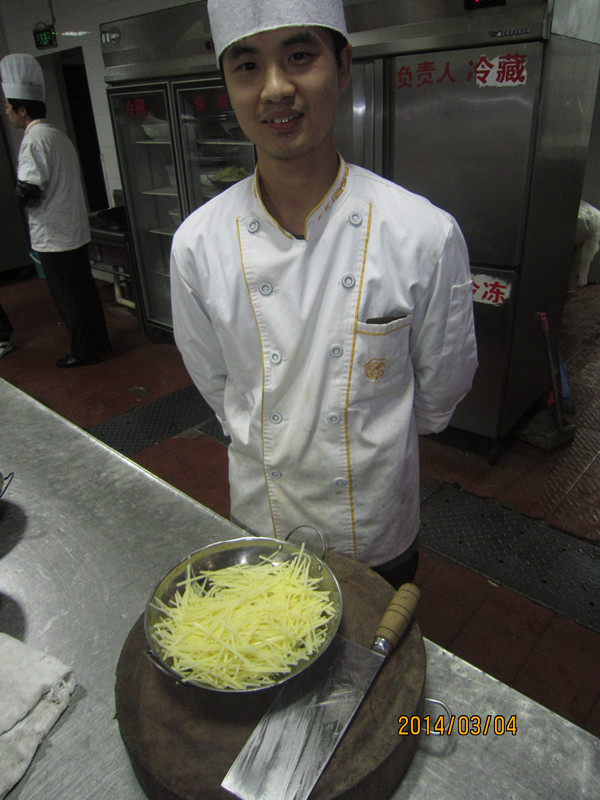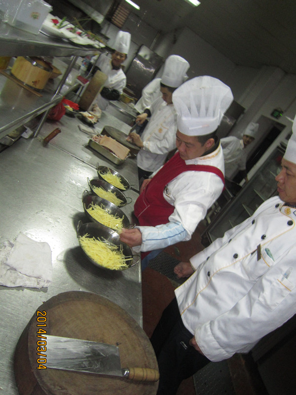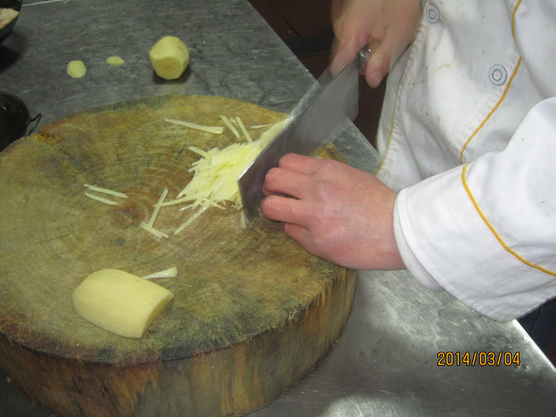 本月开展的为案板厨师切土豆丝比赛,后堂四名案板参加比赛炉台厨师担任评委,从时间和外形两个方面来进行评比,最终王友志获得了比赛的第一名。