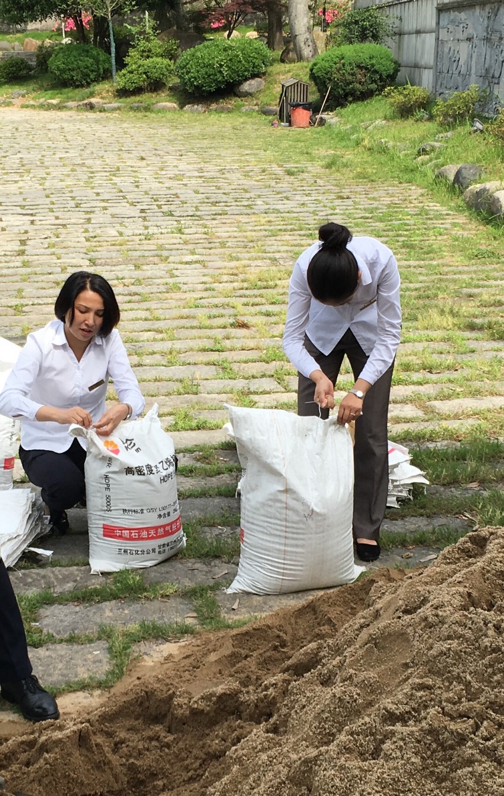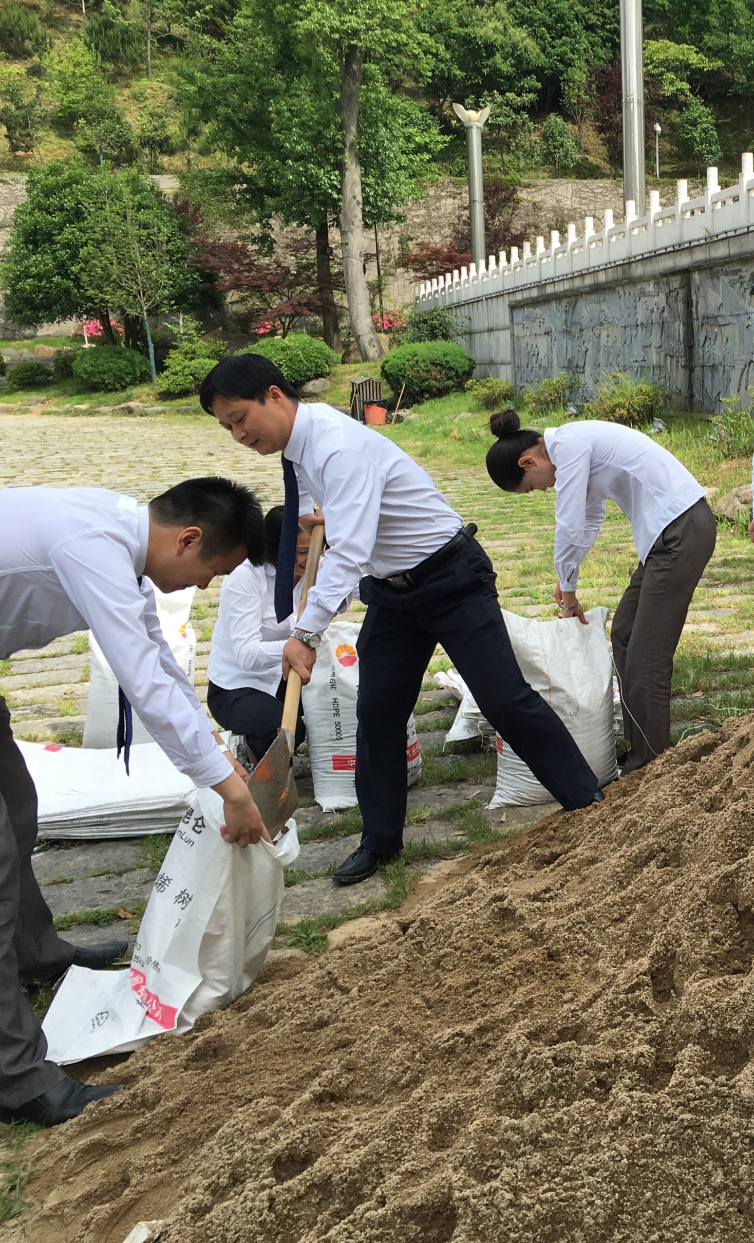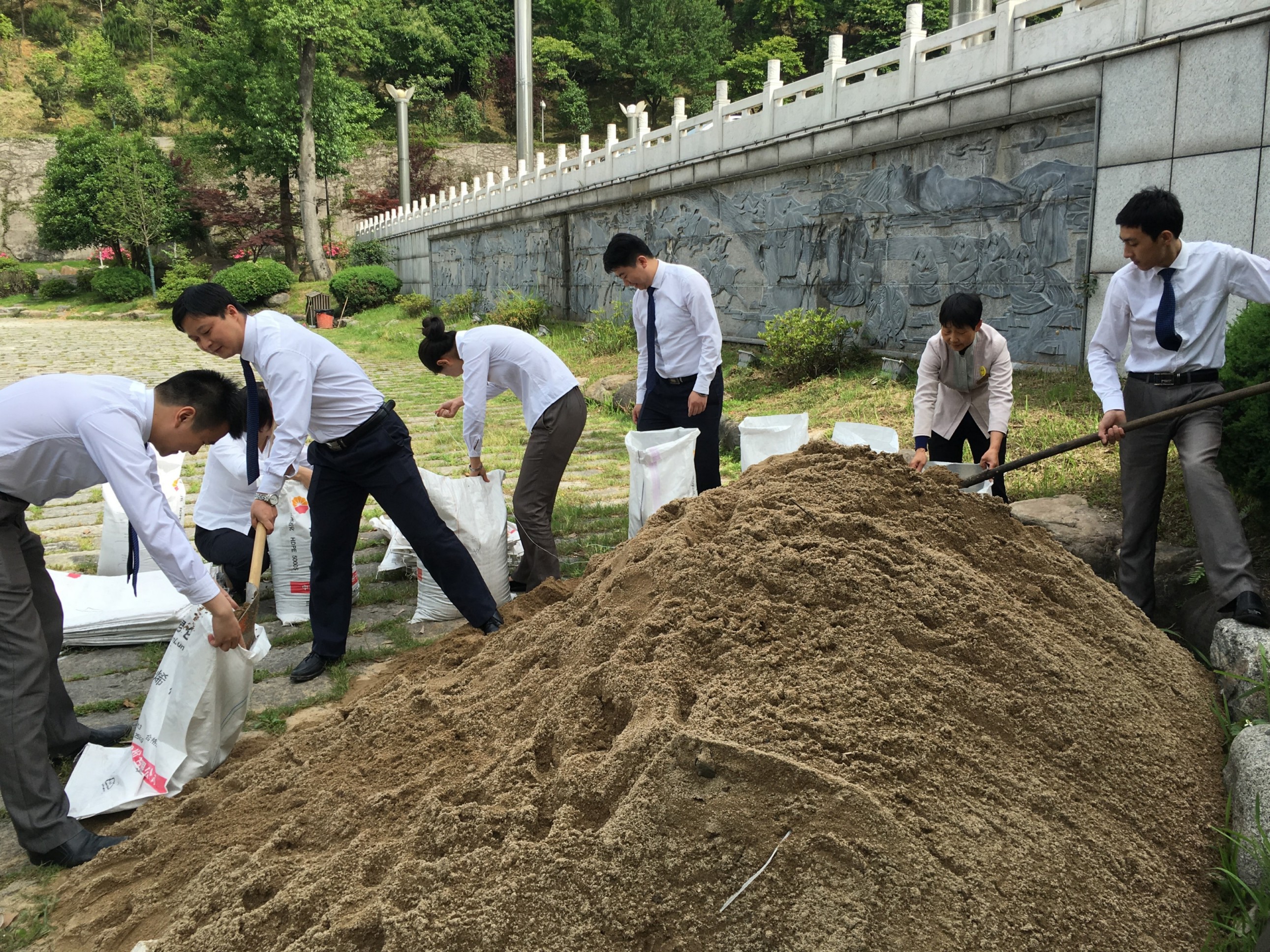 6月10日上午,烈日炎炎,在迎驾山庄停车场旁边,一群身着工作服的山庄行政人员,正有条不紊地进行防汛沙袋的装、缝工作。这是山庄人员在此进行未雨绸缪的防汛物资装备工作。 山庄负一层地势低,但重点工作区域厨房、工程部、中心电力系统等都集中在负一层,是防汛期间重要的防守地点。较往年汛期时间以及防汛工作的经验,山庄在徐总的带领下,选择了在汛期来临之前进行防汛物资准备。 此次防汛物资准备由徐总亲自带领,由各部门负责人及办公室人员参与,从编织袋的申领,到沙土的运达到现场装袋、缝制、搬运到放置地点堆放一条龙进行,循序渐进,一上午时间,大家共装缝沙袋近百余袋。 为了做好安全防汛工作,装缝沙袋只是防汛工作的一个方面,山庄将动员全员进一步加强防汛抢险的实战能力和应急处置能力,以更好地应对可能出现的紧急情况,将安全防汛落到实处。
