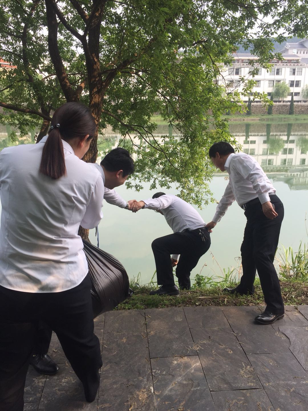 4月28日下午,山庄党员及入党积极分子、工会委员、团支部委员、行政后勤管理人员一行40余人在边总和汤总的带领下走向街头,大家头戴小红帽、手拿垃圾袋等工具对迎驾苑至黄岩洞区域道路、河面、山林的进行了细致的清理,同时还积极倡导广大游客文明旅游、保护自然环境,为最美酒乡的最美环境贡献自己的一份力量。