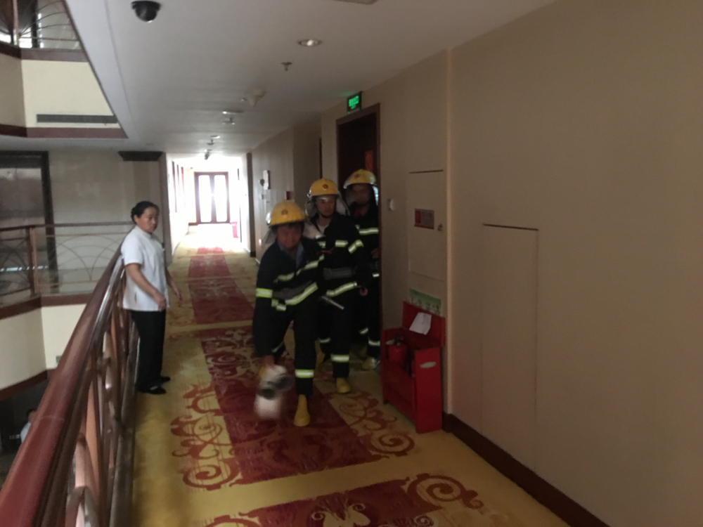 随着演习总指挥边总的一声令下,演习正式开始9405房间烟感随机报警,灭火搜救组、疏散引导组、通讯联络组、安全保卫组、伤员救护组五大小组在指挥中心的调度下立即展开了行动,在既定的时间内圆满的完成了人员疏散、火灾扑救、伤员救护、现场警戒等各项工作任务,成功完成了此次演练。